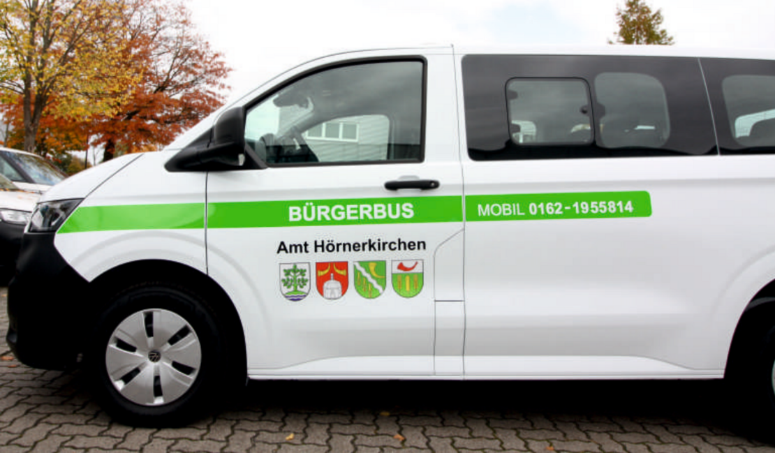 Der Bürgerbus fährt ab dem 03. November 2025 alle Einwohnerinnen und Einwohner aus dem Amtsbereich Hörnerkirchen auf Anfrage kostenlos zum Arzt, zum Einkaufen, zu Freunden, zum Amt, zum Friseur oder sonstigen Unternehmungen. Fahrten werden in Brande-Hörnerkirchen, Bokel, Osterhorn, Westerhorn und nach Barmstedt angeboten. Für medizinische Zwecke fährt der Bürgerbus auch nach Elmshorn.